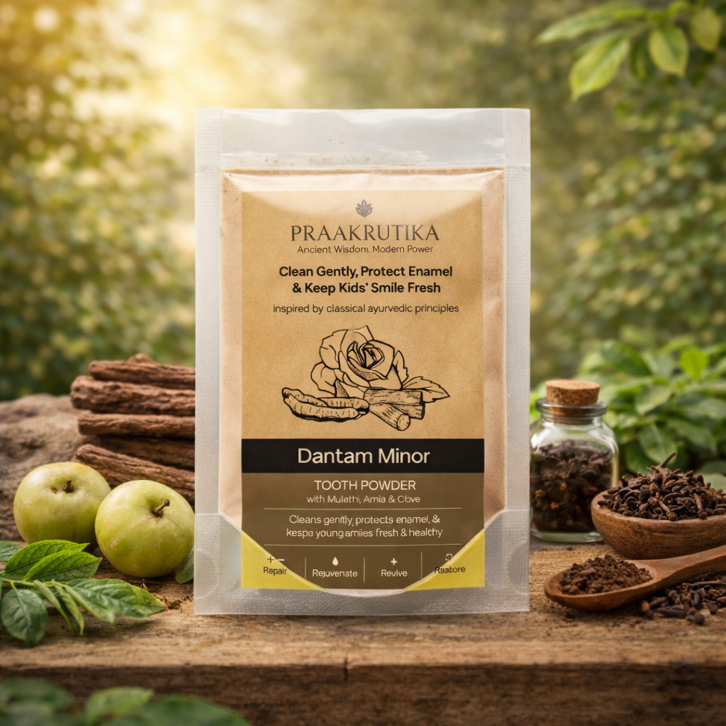 Prakrutika DANTAM MINOR Tooth Powder is a mild, 100% herbal oral care solution specially designed for children and sensitive mouths. Carefully blended with herbs like Mulethi, Amla, Haritaki, Baheda, Babool, Neem, Haldi, Tulsi, Clove, Mint, and Cardamom, it gently cleans teeth, strengthens gums, prevents cavities, and keeps breath fresh naturally. Its soothing, sweet, and aromatic formulation makes brushing a fun, enjoyable experience while ensuring oral health, enamel protection, and gentle detoxification. Free from harsh chemicals, this tooth powder nurtures developing teeth, promotes healthy gums, and supports a confident, bright, and happy smile that parents can trust and children love.